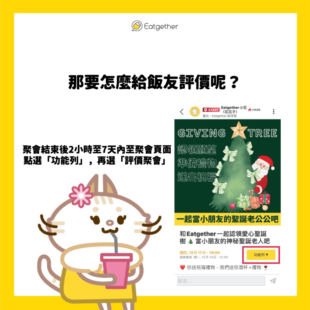 你可以在聚會結束時間後兩小時至七天內給主辦人、同場聚會的參加者評價