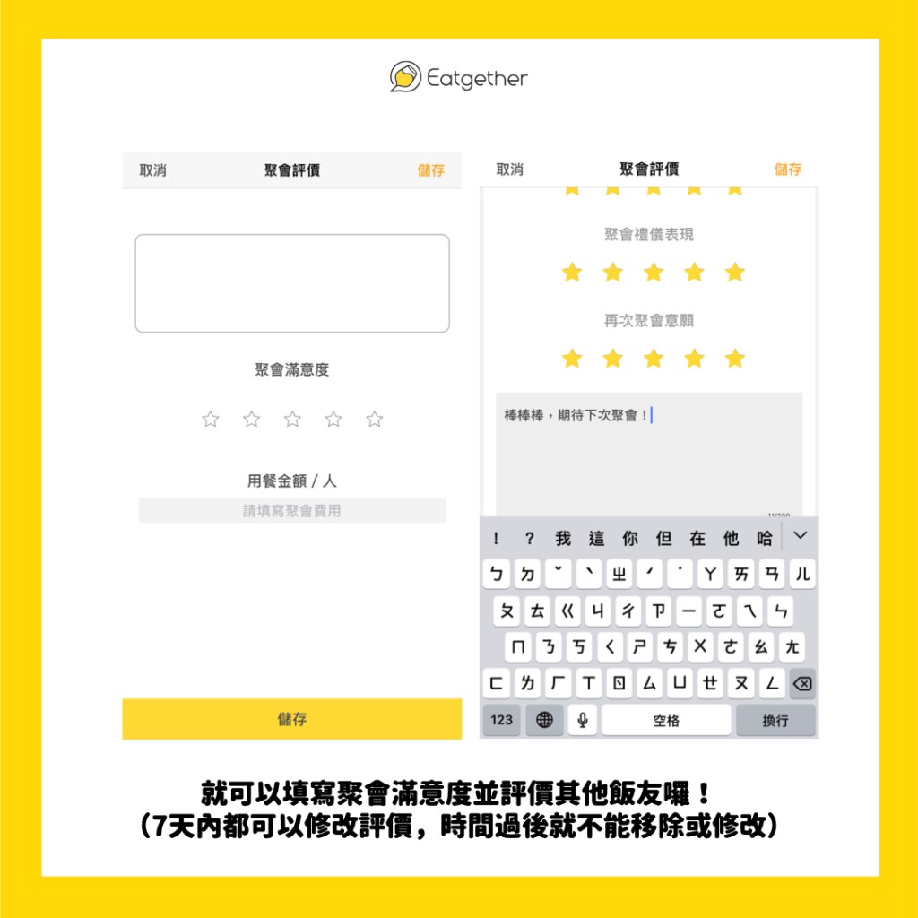 主辦/參加聚會的主人與參加者皆有「評價飯友」的權利。