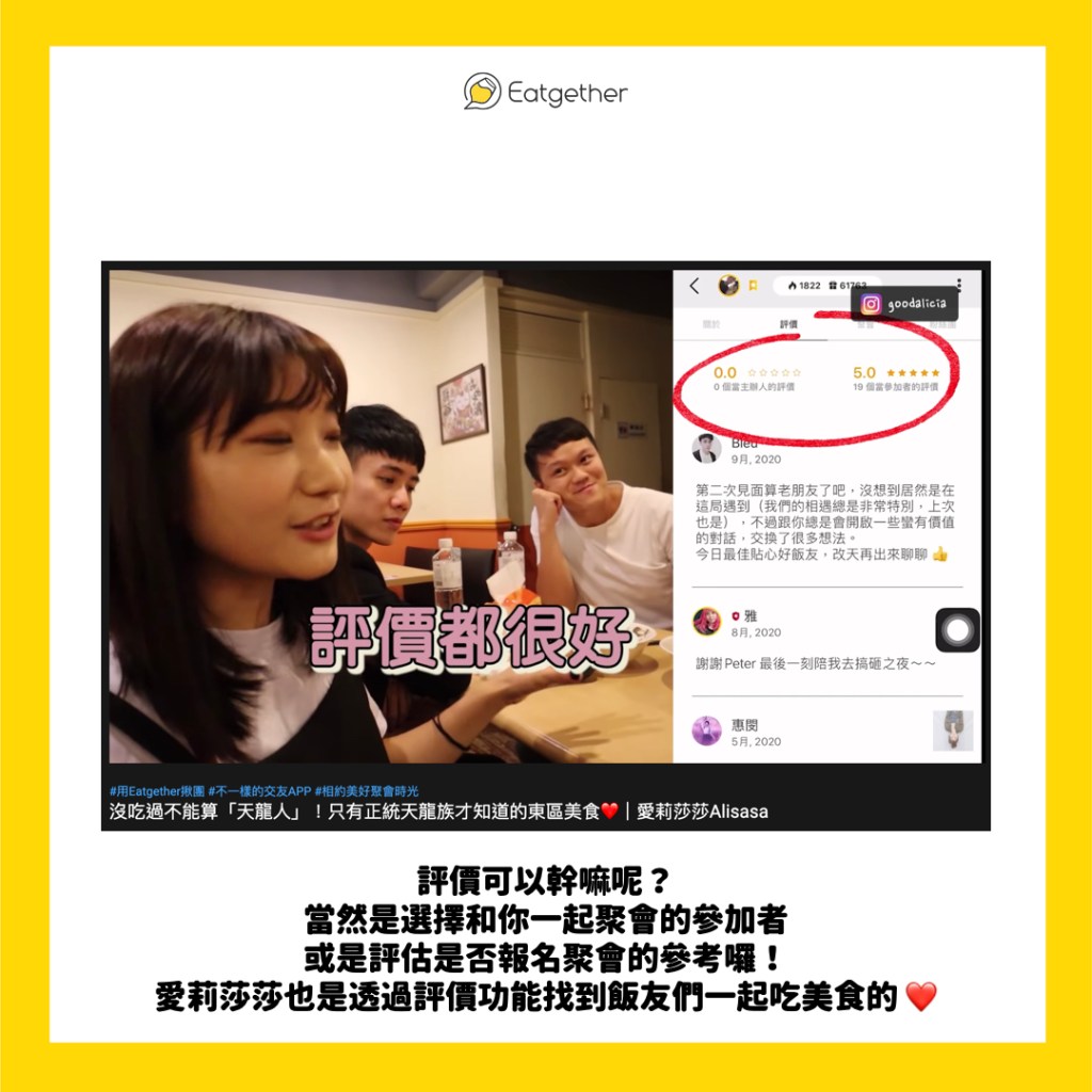 可以看到別人給予該使用者的評論內容再去抉擇要不要參加他的聚會或獲選他參加哦!