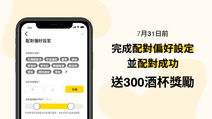 歡慶新改版!7月31日前完成「配對偏好設定」且配對成功就送300酒杯獎勵