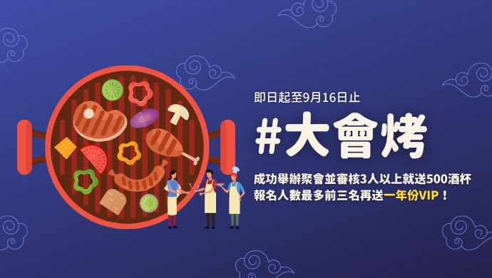 即日起至9月16日前舉辦烤肉聚會(燒烤、戶外烤肉、屋頂烤肉等都符合!),聚會標題加上 「#大會烤」,成功聚會並審核3人以上就送500酒杯。活動期間「報名人數」最多人的前三名聚會,主辦人還能再獲得「VIP一年份+5000酒杯」,讓你一整年辦聚會、滑專屬配對用好用滿,朋友一籮筐!