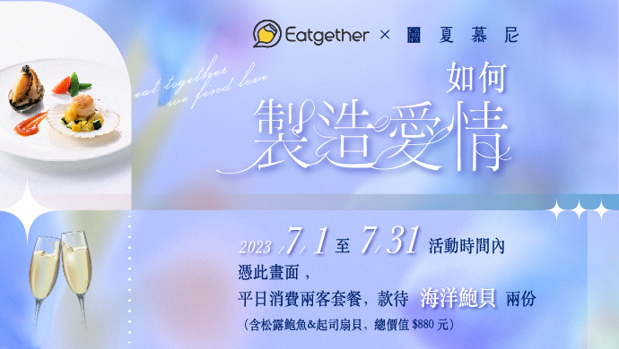 這次 Eatgether 與夏慕尼攜手合作,只要在 2023/7/1 ~ 2023/7/31 活動期間的平日,舉辦兩人聚會到夏慕尼全台任一分店消費兩客套餐,出示活動主視覺畫面即可獲得「海洋鮑貝」兩份(含松露鮑魚&起司扇貝,總價値$880元)