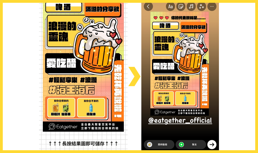 記得將測驗結果圖發佈至Instagram限時動態,標記Eatgether Instagram官方帳號「@eatgether_official」,並設為公開!