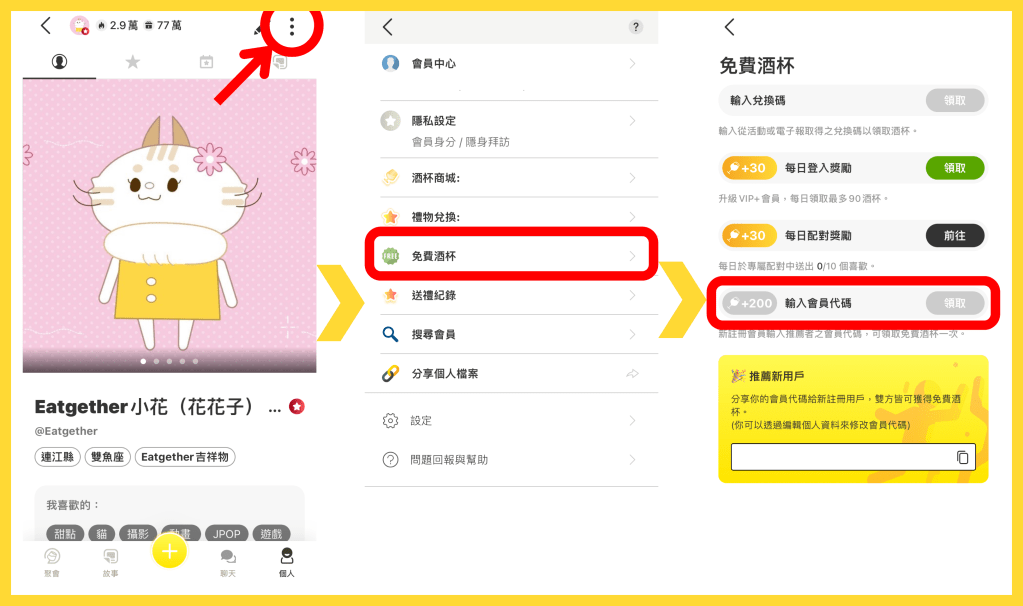 (進入個人頁面點擊右上角進入設定→點選「免費酒杯」→於「輸入會員代碼」處輸入專屬推薦代碼即可領取。)