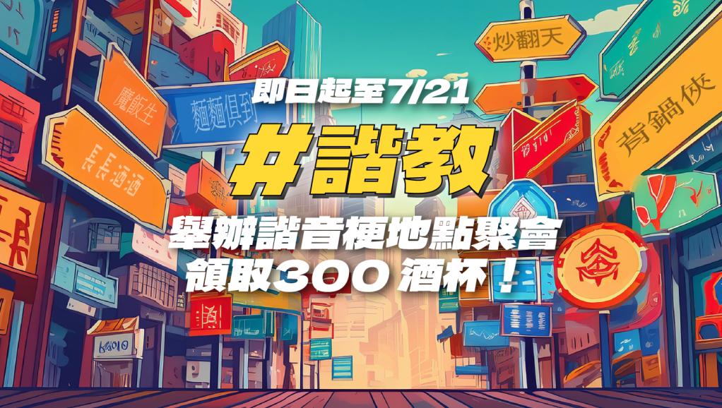 即日起至 7 月 21 日止,只要在聚會標題加上「#諧教」並前往有諧音梗的地點聚會,成功聚會主辦人獎勵 300 酒杯,還有機會抽中統一集團通用禮券$1000(無效期) !